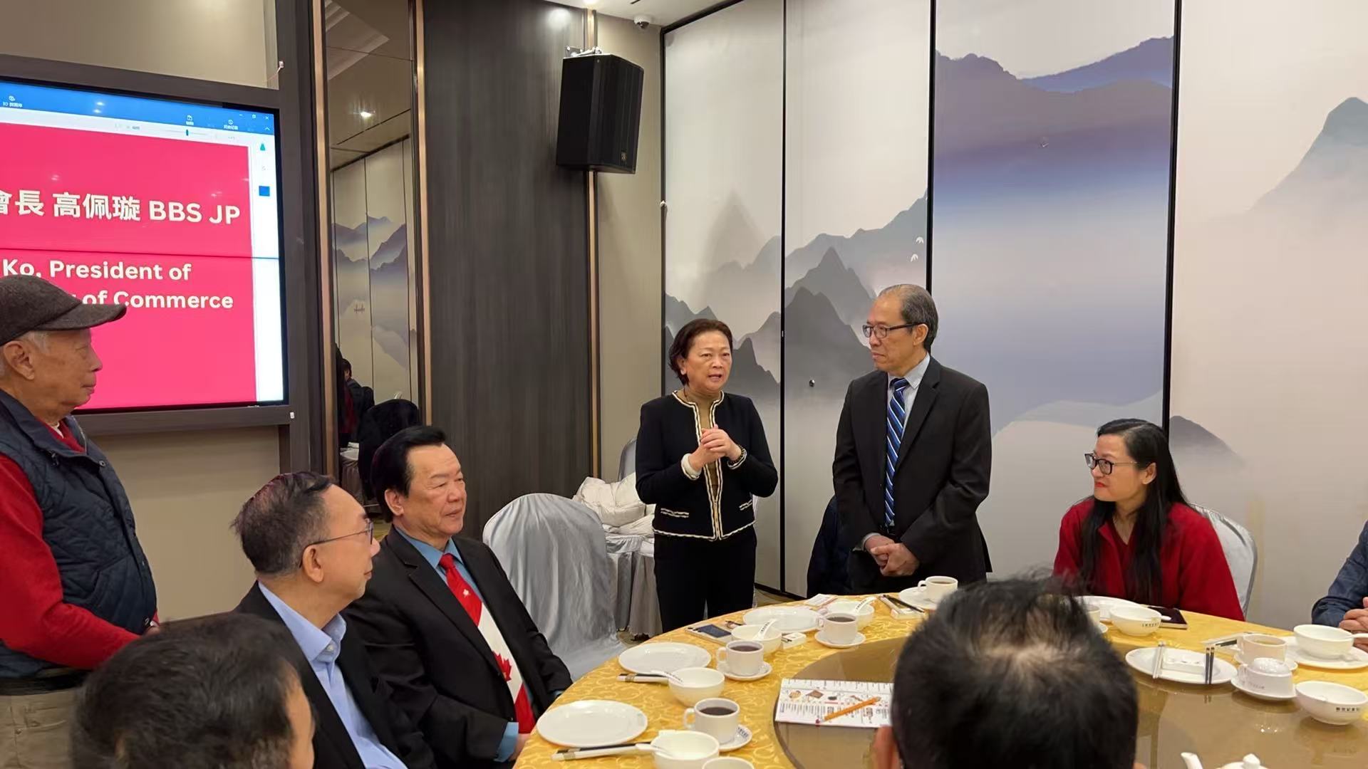 高佩璇會長向大家介紹了香港潮州商會,希望此次拜訪能加強與加拿大潮籍社團及鄉親的聯絡。同時,她指出,加拿大擁有近兩百萬華人及毗鄰美國的地理優勢,是促進雙邊經濟合作的重要基礎。