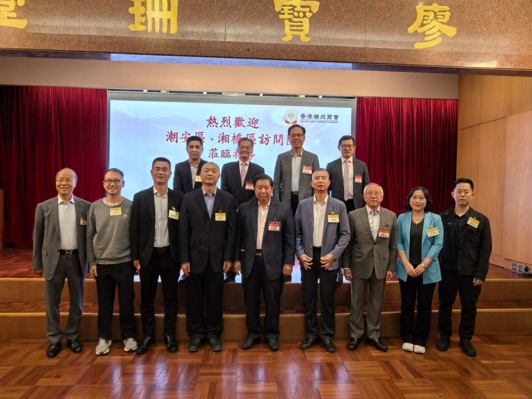 2025年10月24日下午,香港潮州商會熱烈歡迎由潮安區政協主席余少鋒、湘橋區政協主席黃奕湘率領的潮安區、湘橋區訪問團一行,於會所十樓禮堂舉行座談會。本會永遠名譽會長黃書銳代表商會全體同仁,向遠道而來的家鄉領導表示誠摯歡迎。會上,三方進行了親切交流,並互贈紀念品及合影留念,氣氛溫馨熱烈。