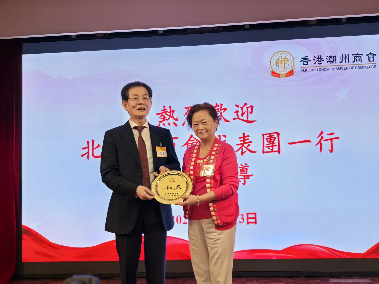 高佩璇會長致歡迎辭,對北京潮商會陳才雄會長一行的到來表示熱烈的歡迎。她簡要回顧了香港潮州商會的悠久歷史與創會宗旨,指出商會成立逾一個世紀以來,始終凝聚潮籍精英,傳承潮商精神,為香港的繁榮穩定和國家的發展作出了積極貢獻。她特別強調,香港潮州商會與北京潮商會淵源深厚,友誼歷久彌新。從2018年陳才雄會長率團參加由本會主辦的第十屆國際潮青聯誼年會,到2019年陳才雄會長率團再次訪港,2024年12月香港潮州商會第54屆就職典禮及2025年1月北京潮商會二十周年慶典兩會首長互訪互動,會務聯繫緊密,情誼不斷深化。高會長進一步指出,京港兩地潮州商會是潮商精神的共同守護者,更是推動京港經濟文化交流、融入國家發展大局的重要力量,期待未來雙方攜手並進,讓合作成果更加豐碩,兩地情誼更加深厚。